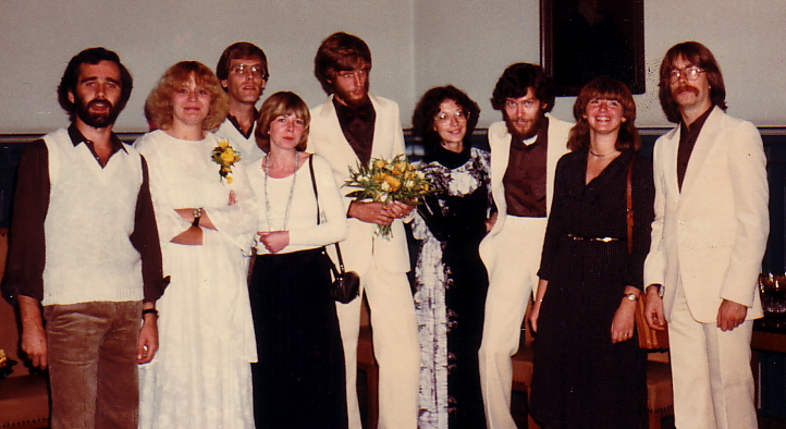 Ziet die jurk er bekend uit? Ellen en Joop bij hun promotie, 1979, Utrecht, met paranymfen (van links naar rechts: Bert van der Zwaan, Ellen, Ton en Carla Romein, Joop, Connie en Manfred van Bergen, Godelieve en Piet Hein Baelde).