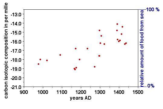 Figure 3. Carbon isotopic values in collagen in bones of people buried in the Viking villages in western Greenland, plotted versus age of the bones. (Radiocarbon, 1999).