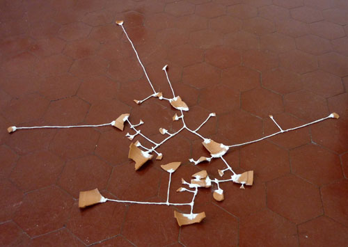 Terracotta plates, bowls and pots dropped on the floor and smashed, their fragments linked by line in their new locations and proximities.