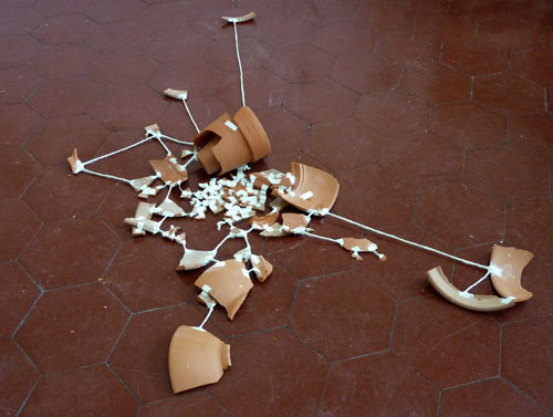 Terracotta plates, bowls and pots dropped on the floor and smashed, their fragments linked by line in their new locations and proximities.